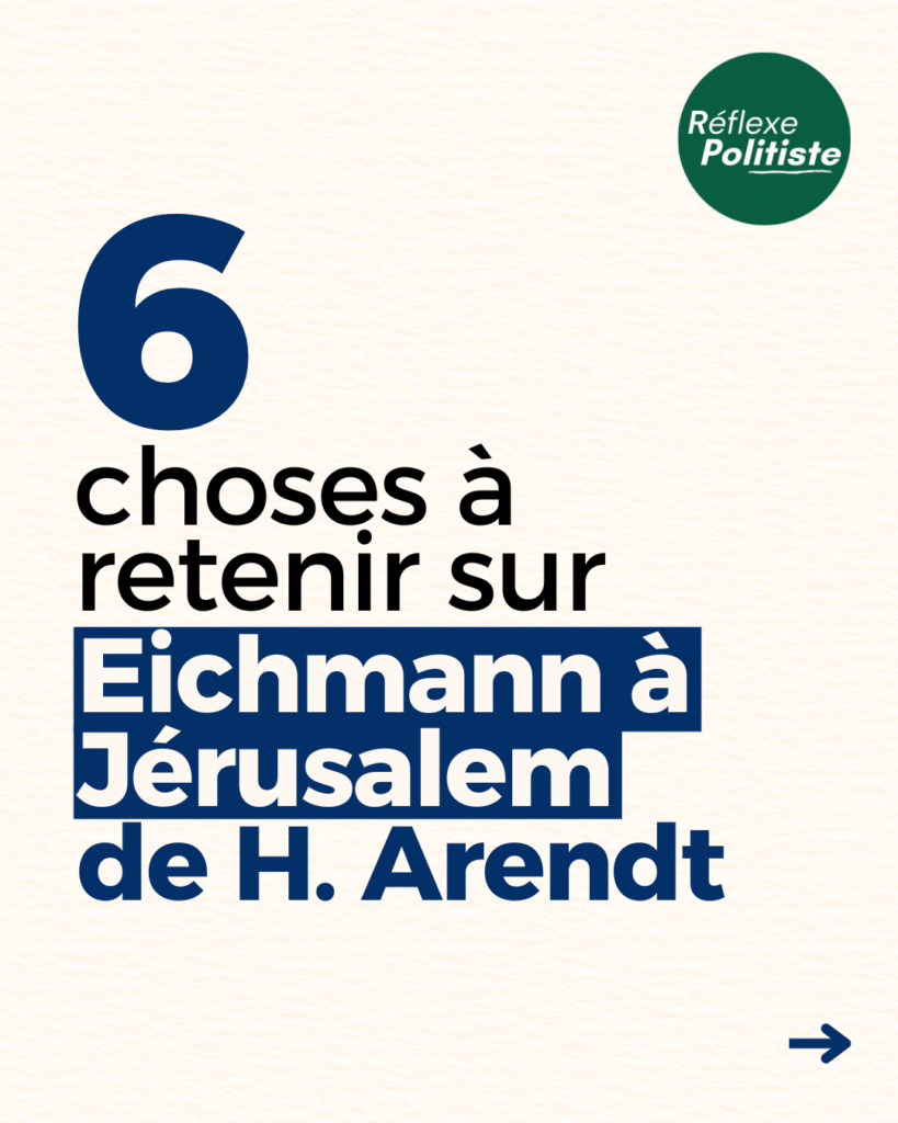 «Eichmann à Jérusalem (1963) est à la fois un ouvrage de réflexion philosophique et un compte rendu du procès d’ Eichmann que l’autrice à suivi. A. Eichmann est un membre du parti nazi, un criminel de guerre et un fonctionnaire du Troisième Reich. Durant la Seconde Guerre mondiale, il s’occupe de la logistique de la solution finale. »